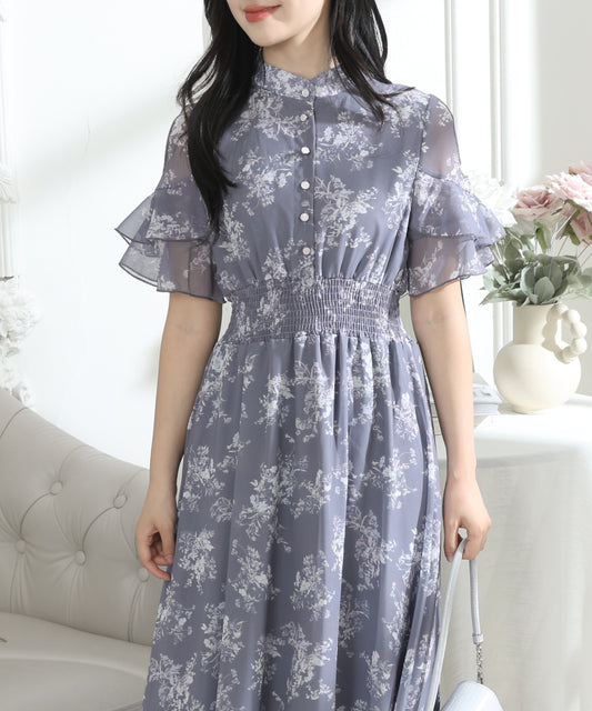花柄 袖コンシャス フリル スタンドカラー ワンピース