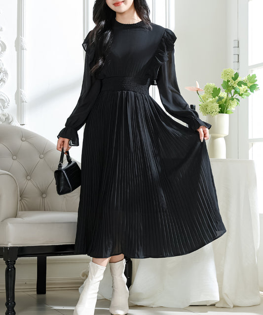 肩フリル プリーツ キャンディスリーブ ロング ワンピース