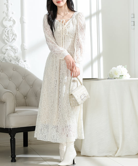 総レース ウエスト 切り替え タックスリーブ ロング ワンピース