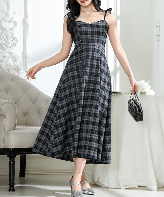 タータンチェック 肩リボン ロング キャミソール ワンピース
