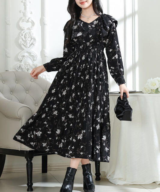 フラワー プリント 肩フリル 消しプリーツ ロング ワンピース