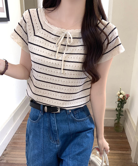パンチング リボン付き ラグラン 半袖 ニット プルオーバー