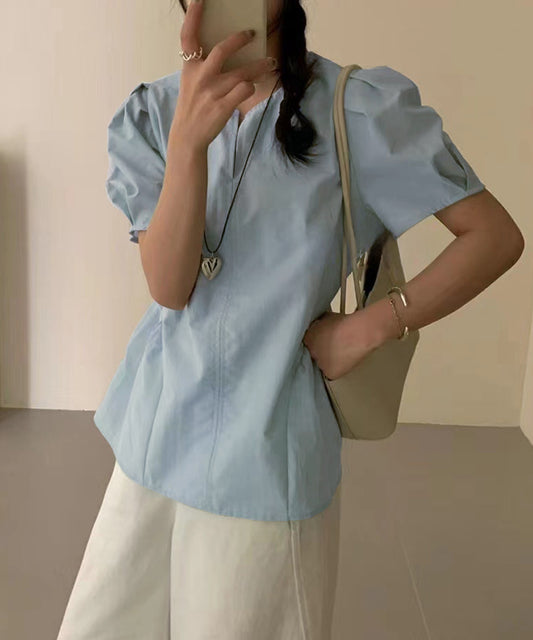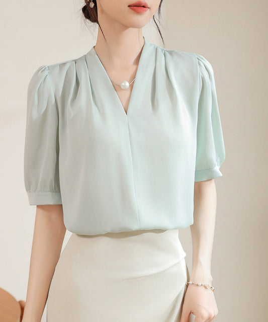 Vネック タック パフスリーブ 半袖 ブラウス