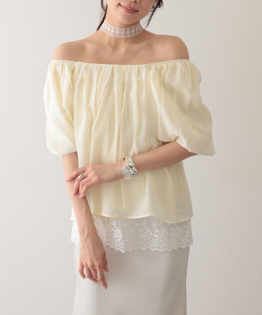 オフショルダー フリルレース サイドシャーリング パフスリーブ ブラウス