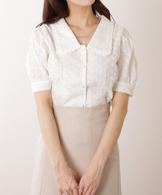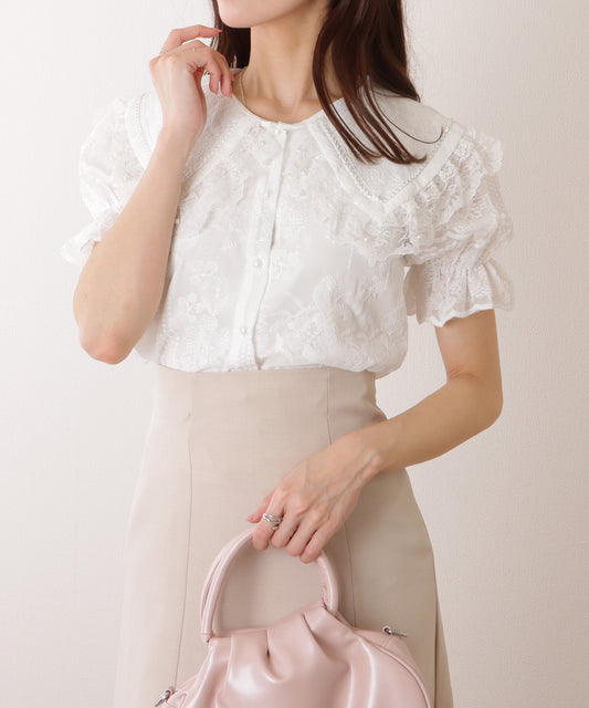 ビッグカラー レース フリル 刺繍 半袖 ブラウス