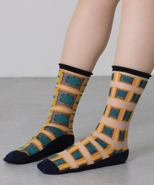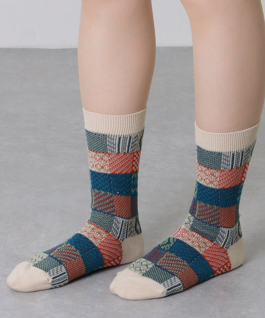 【5足セット】 カラフル レトロ モザイク柄 クルー丈 ソックス