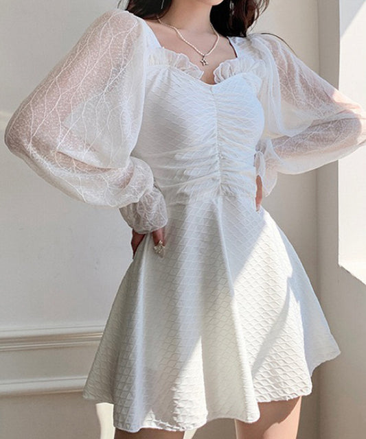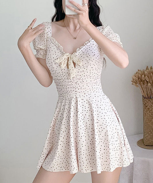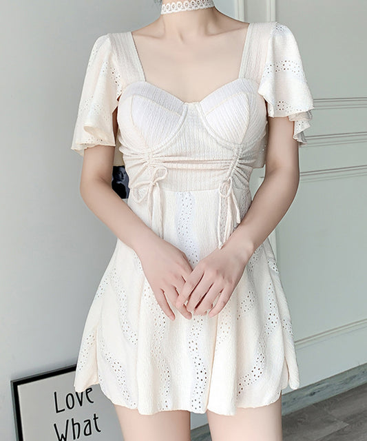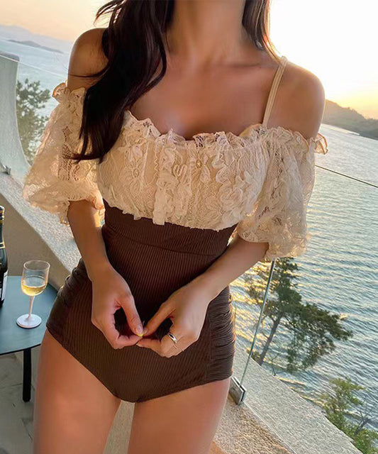 レース ドッキング キャンディ袖 シャーリング スイム ワンピース