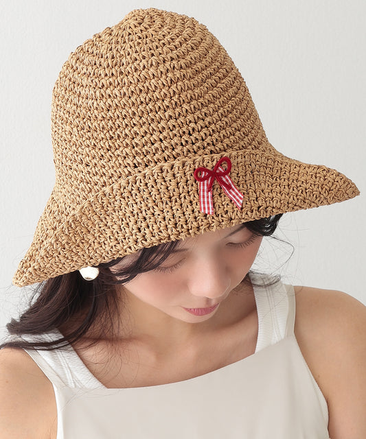 チェック柄 プチ リボン付き メッシュ バケット ハット