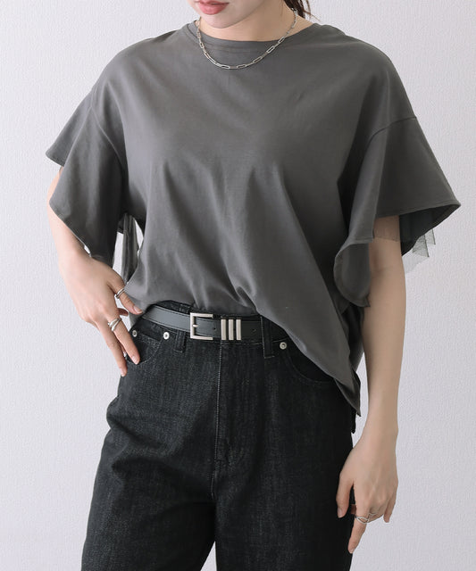 フリルショルダー チュール ドッキング オーバーサイズ 半袖 Tシャツ