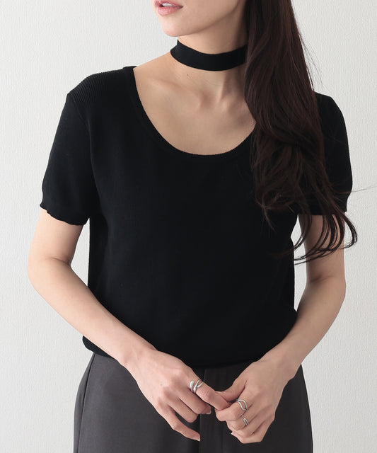 チョーカー付き ラウンドネック 半袖 ニット プルオーバー