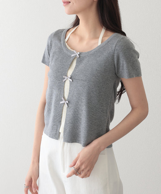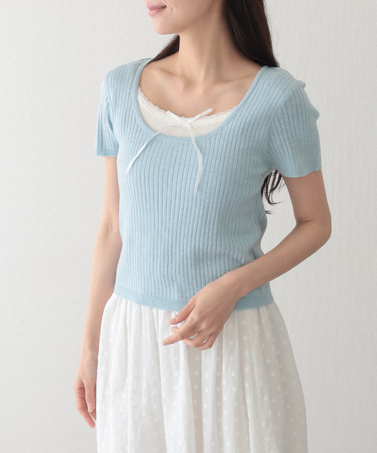 リボン付き インナー ドッキング 半袖 リブ ニット プルオーバー
