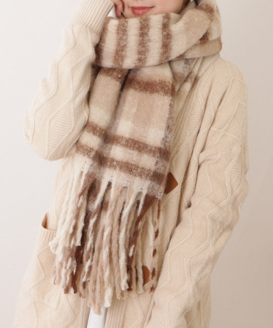 売り切れ配色チェック大判フリンジニットストール