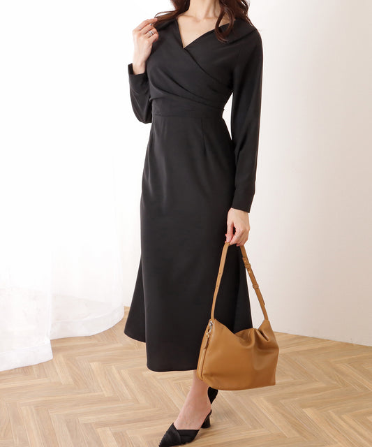 ウエストリボン付きサテン風Aラインワンピース・ドレス