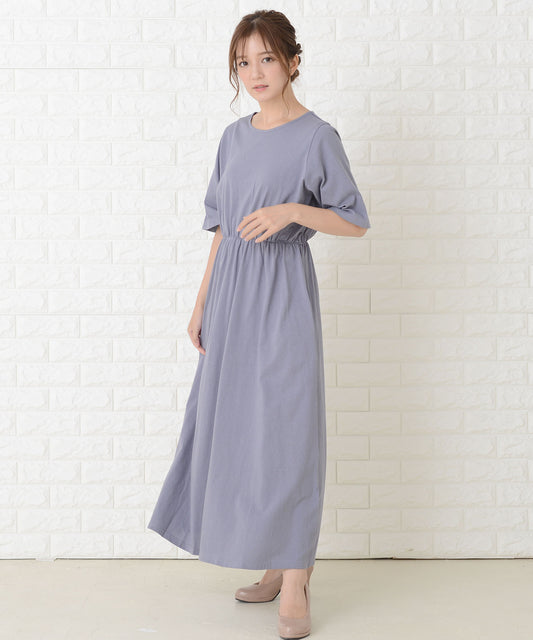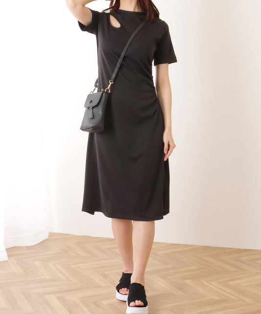 ウエスト ギャザー カットアウト 半袖 ミディ ワンピース