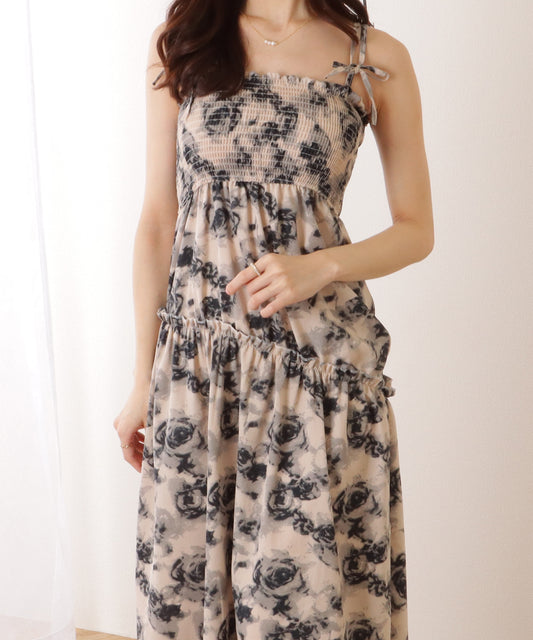ウエスト ギャザー シャーリング 花柄 マキシ ワンピース