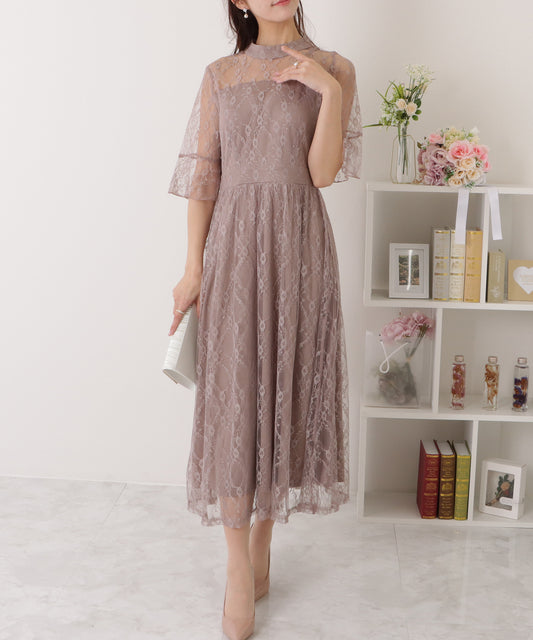 ウエストリボン付きレース袖総レースワンピース・ドレス