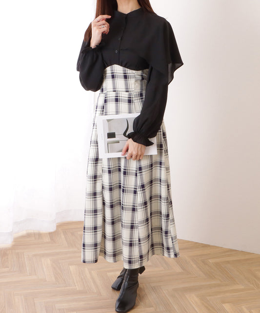 ケープカラー チェック柄 ドッキング ロング ワンピース