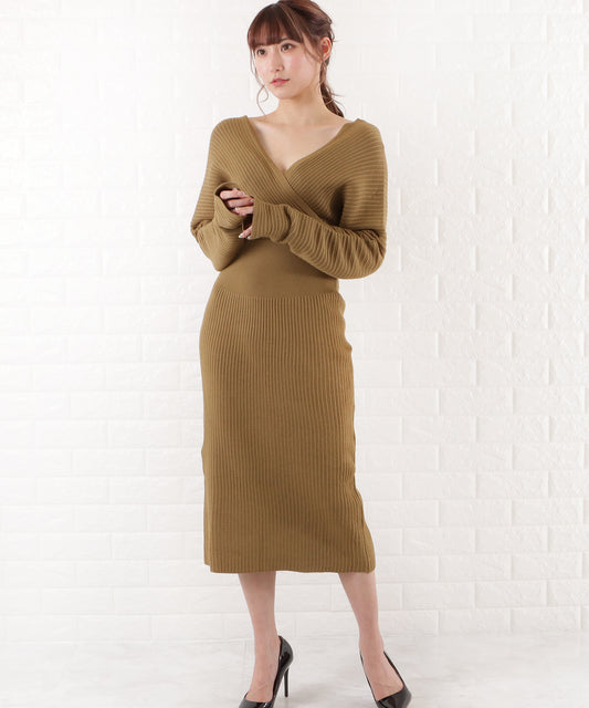 カシュクール風Vネックリブニットワンピース