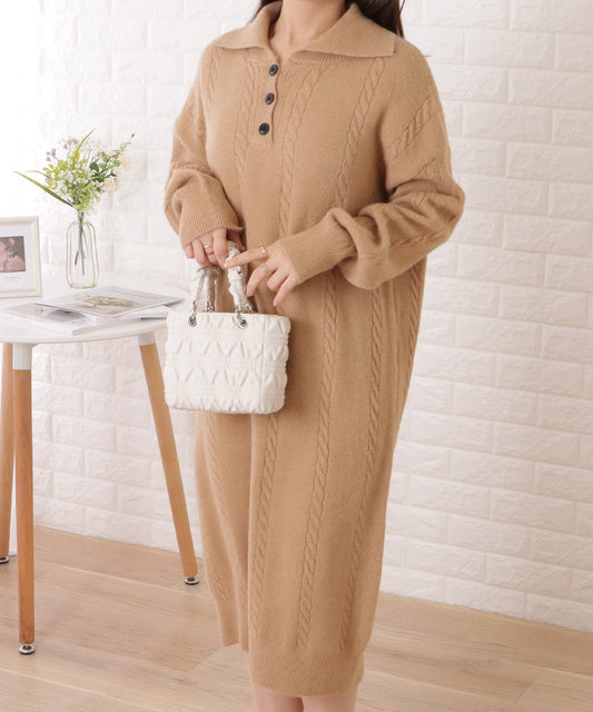 売り切れケーブル柄襟付きゆるニットワンピース