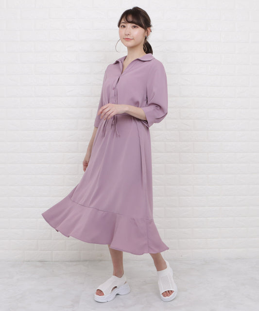 売り切れオープンカラーミモレ丈フレアワンピース