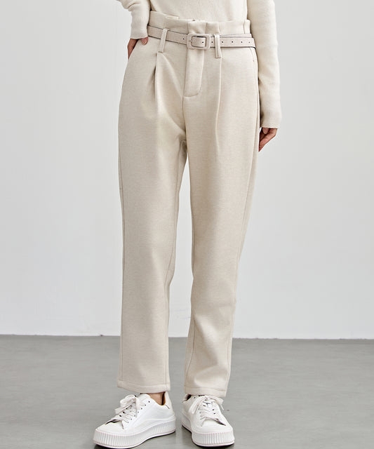 ハイウエスト ベルト付き 裏起毛 テーパード パンツ