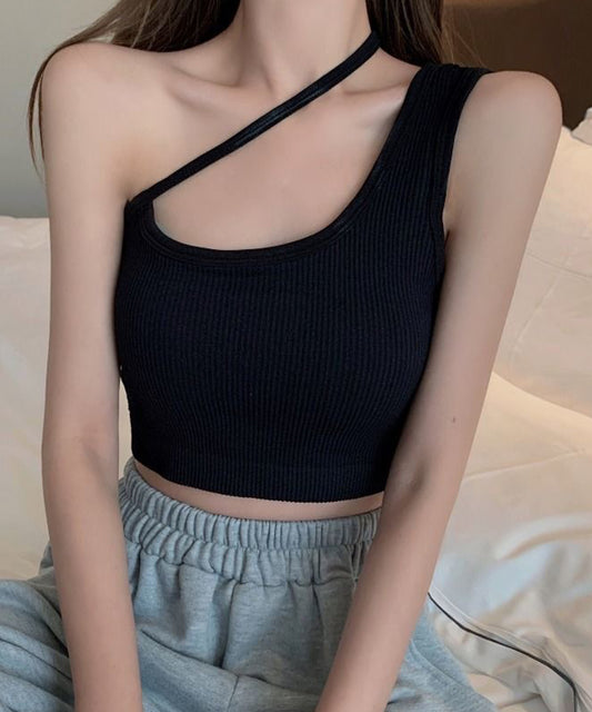 ソリッドカラー ワンショルダー リブ カップ付き ハーフトップ