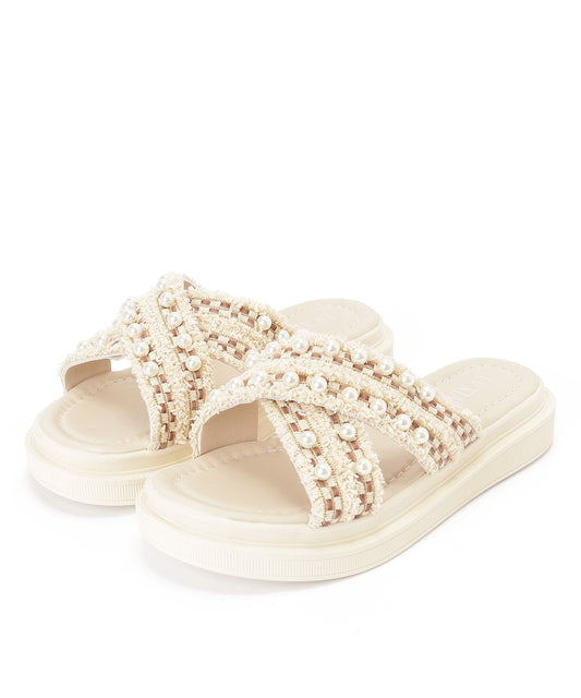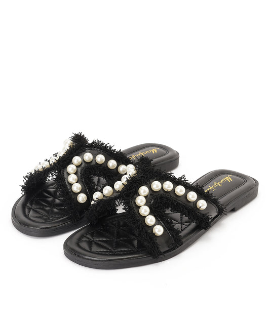パール フリンジ フラット スライド サンダル
