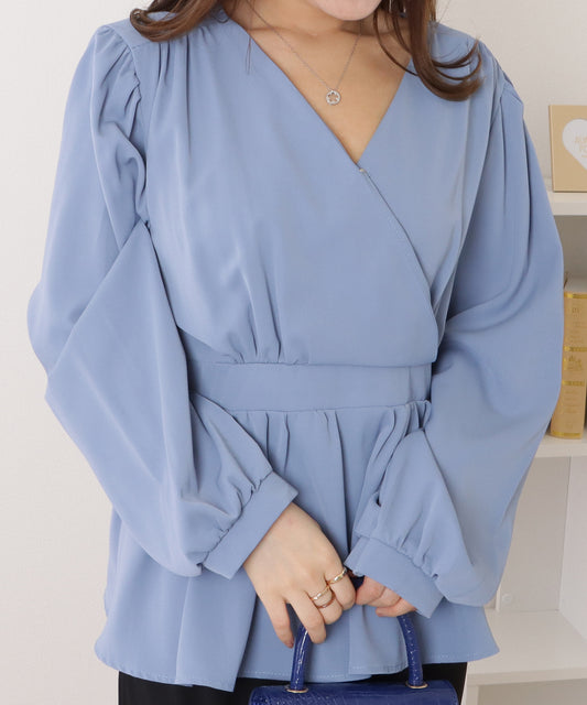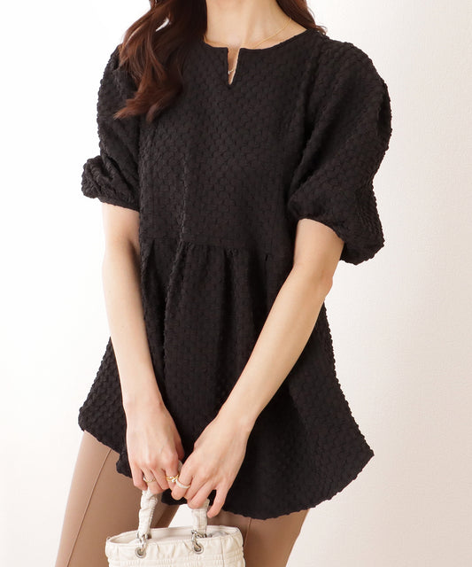 キーネック パフスリーブ ペプラム 半袖 プルオーバー