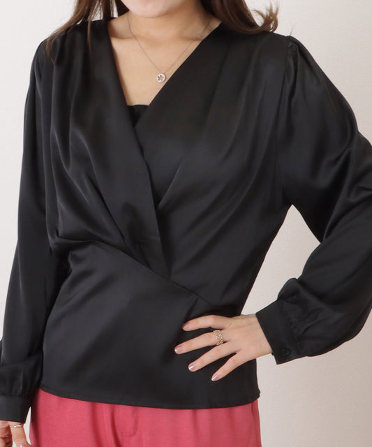 Vネック風 カットアウト ピンタック ディープカフス ブラウス