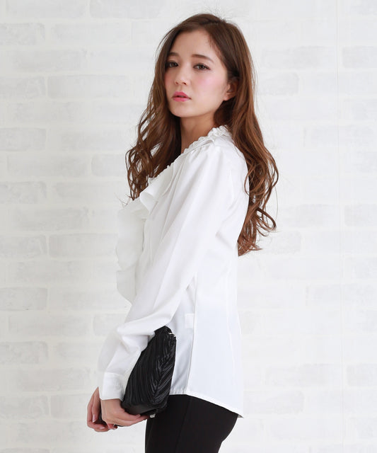 クルーネック長袖フリル付き無地ブラウス シャツ