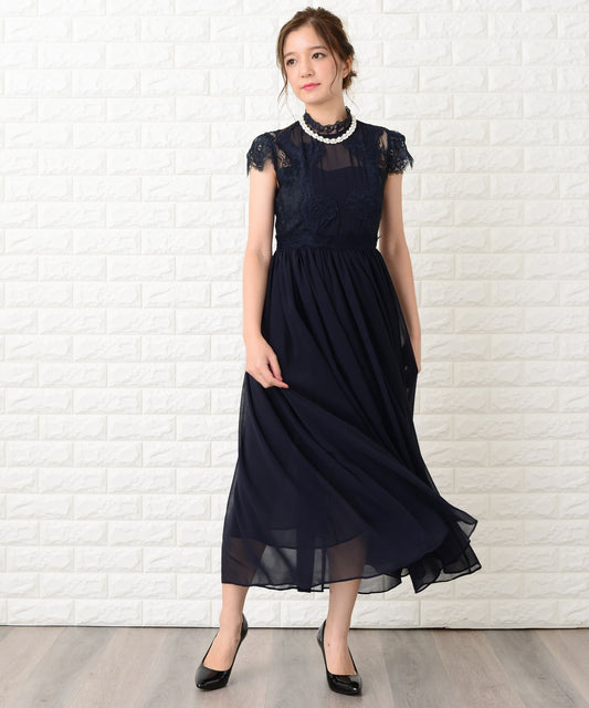 レースとシフォン素材ロング丈 ワンピース・ドレス