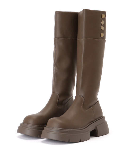 レザー調 サイドボタン 厚底 ラウンド ロング ブーツ