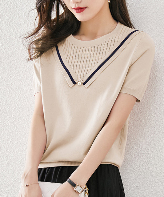売り切れ飾り襟 Vネック風 半袖 薄手 ニット