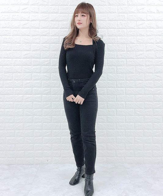 ソリッドカラー スクエアネック 長袖 リブ ニット プルオーバー