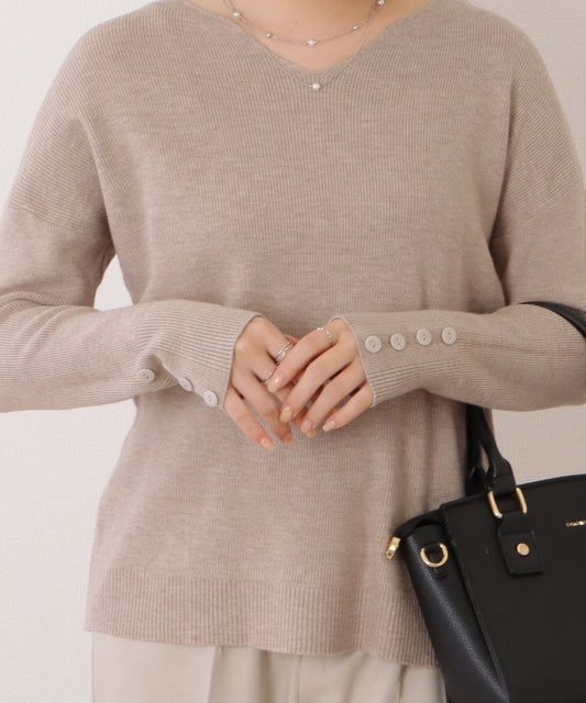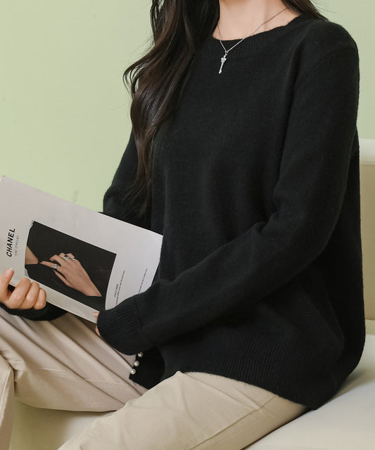 サイドスリット パール付き クルーネック ニット プルオーバー