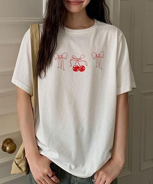 ワンポイント リボン刺繍 クルーネック 半袖 Tシャツ