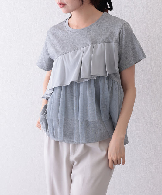 異素材 タックフリル チュール ドッキング 半袖 Tシャツ
