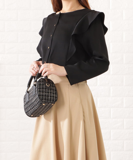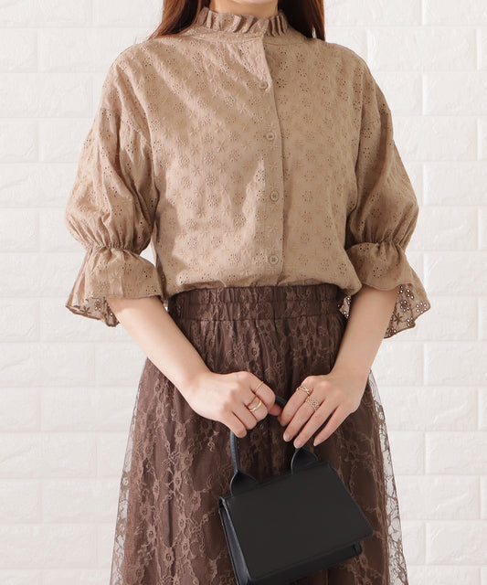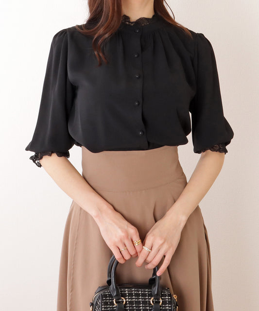 2WAY フリル スタンドカラー パフスリーブ 5分袖 ブラウス