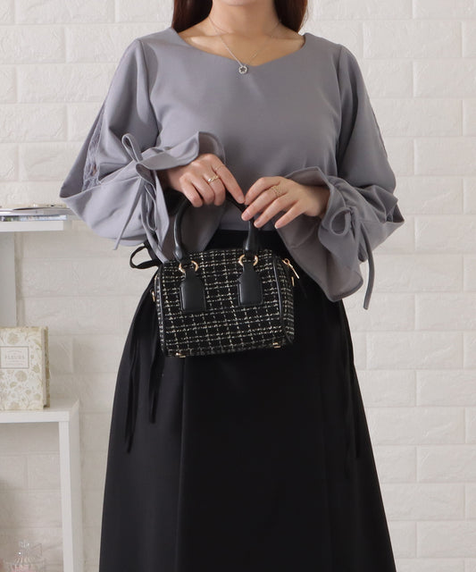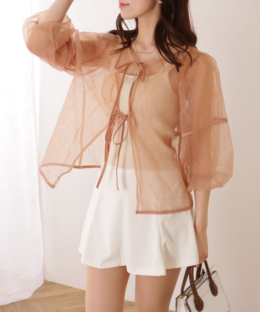 Vネック フロントリボン シャーリング パフスリーブ ブラウス