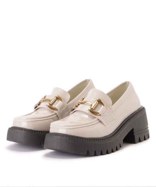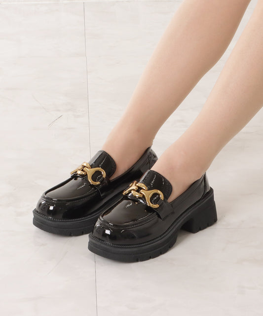 厚底エナメルゴールドビットローファー
