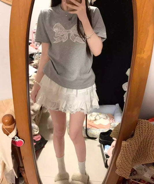 フロント レースリボン クルーネック 半袖 Tシャツ