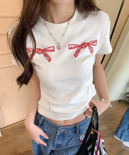 リボン刺繍 クルーネック ショート丈 半袖 Tシャツ