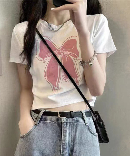 リボンプリント クロップド丈 クルーネック 半袖 Tシャツ
