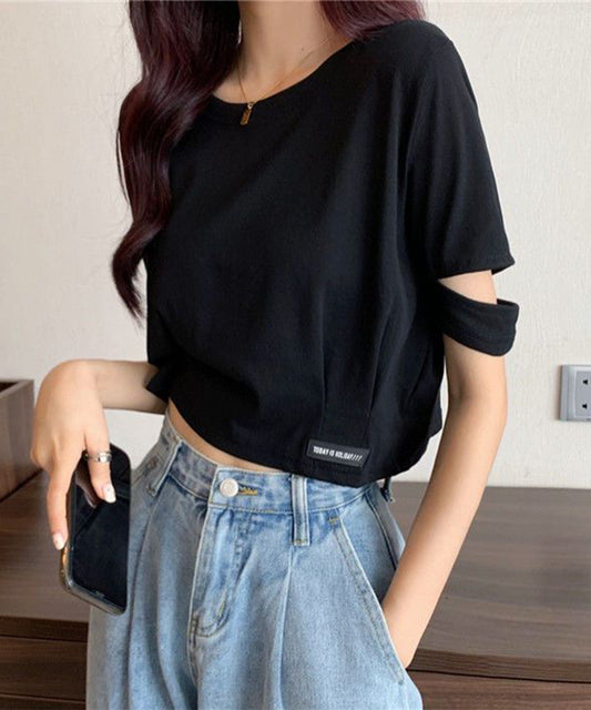 袖 オープンカット クロップド丈 半袖 Tシャツ