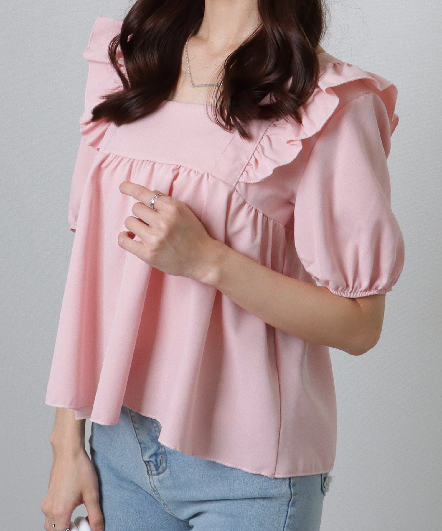 2WAY スクエアネック フリル リボン 半袖 ブラウス