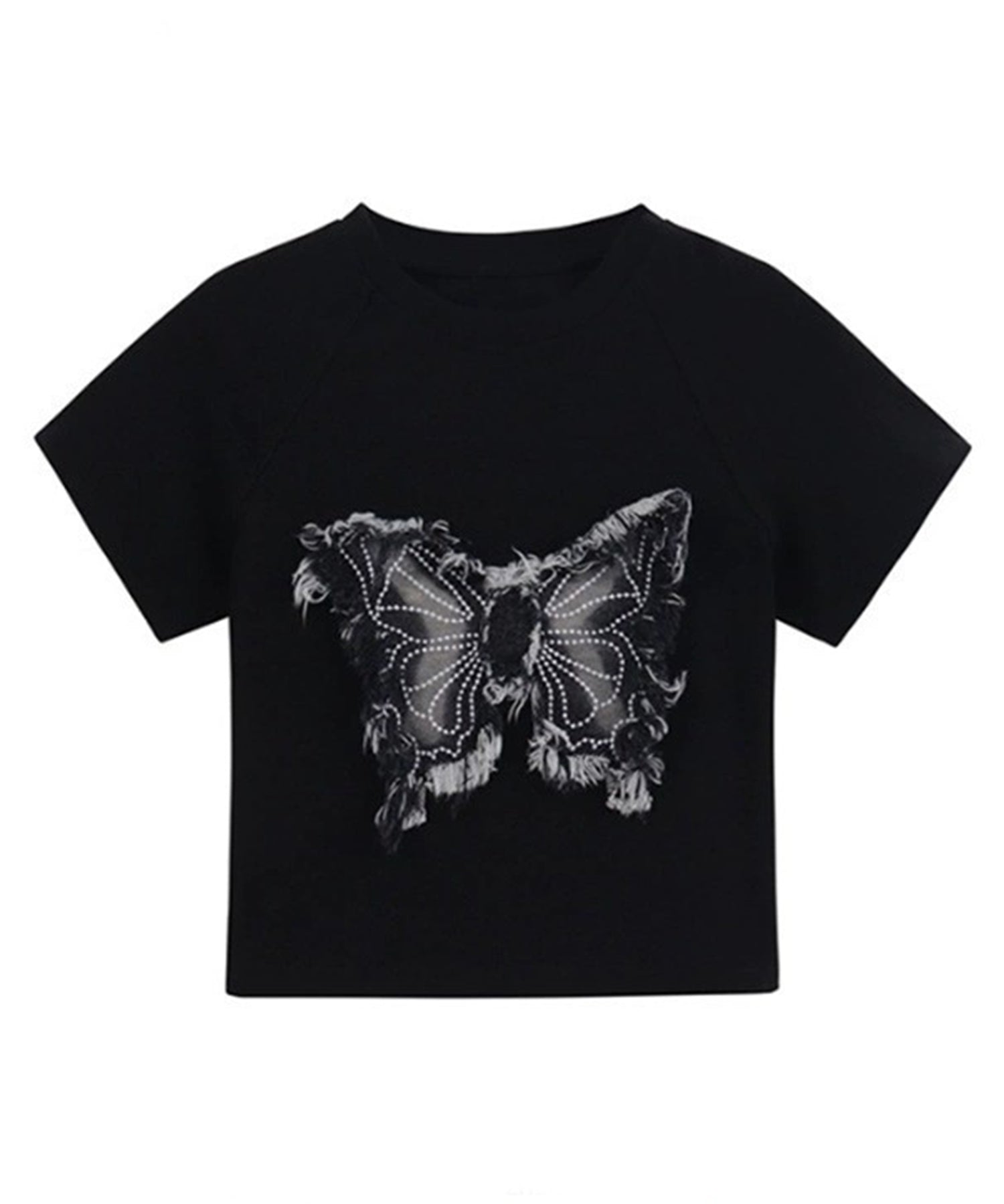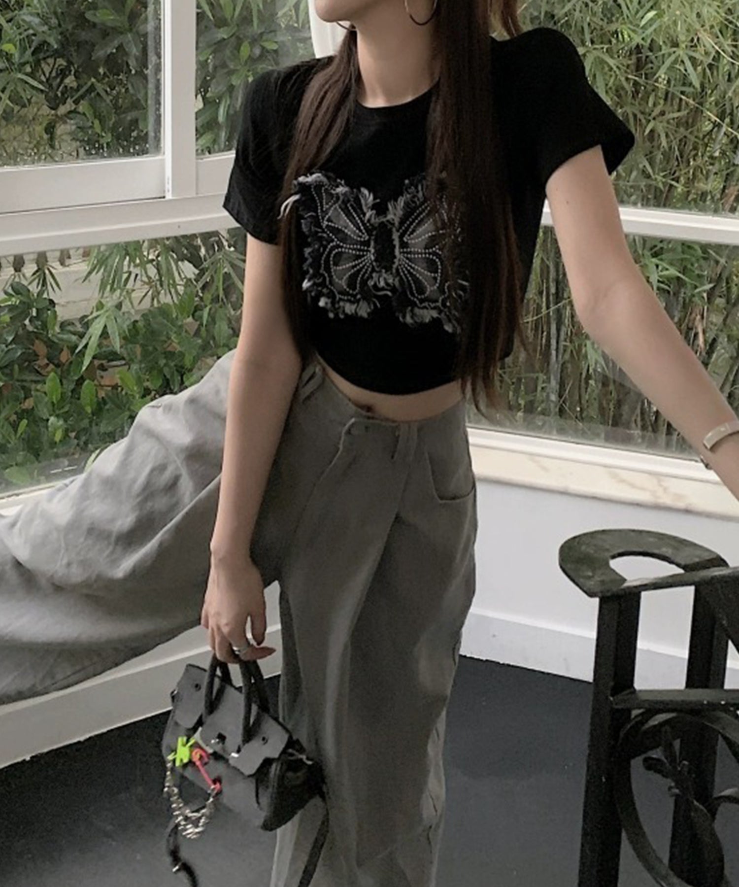 バタフライ クロップド丈 クルーネック 半袖 Tシャツ