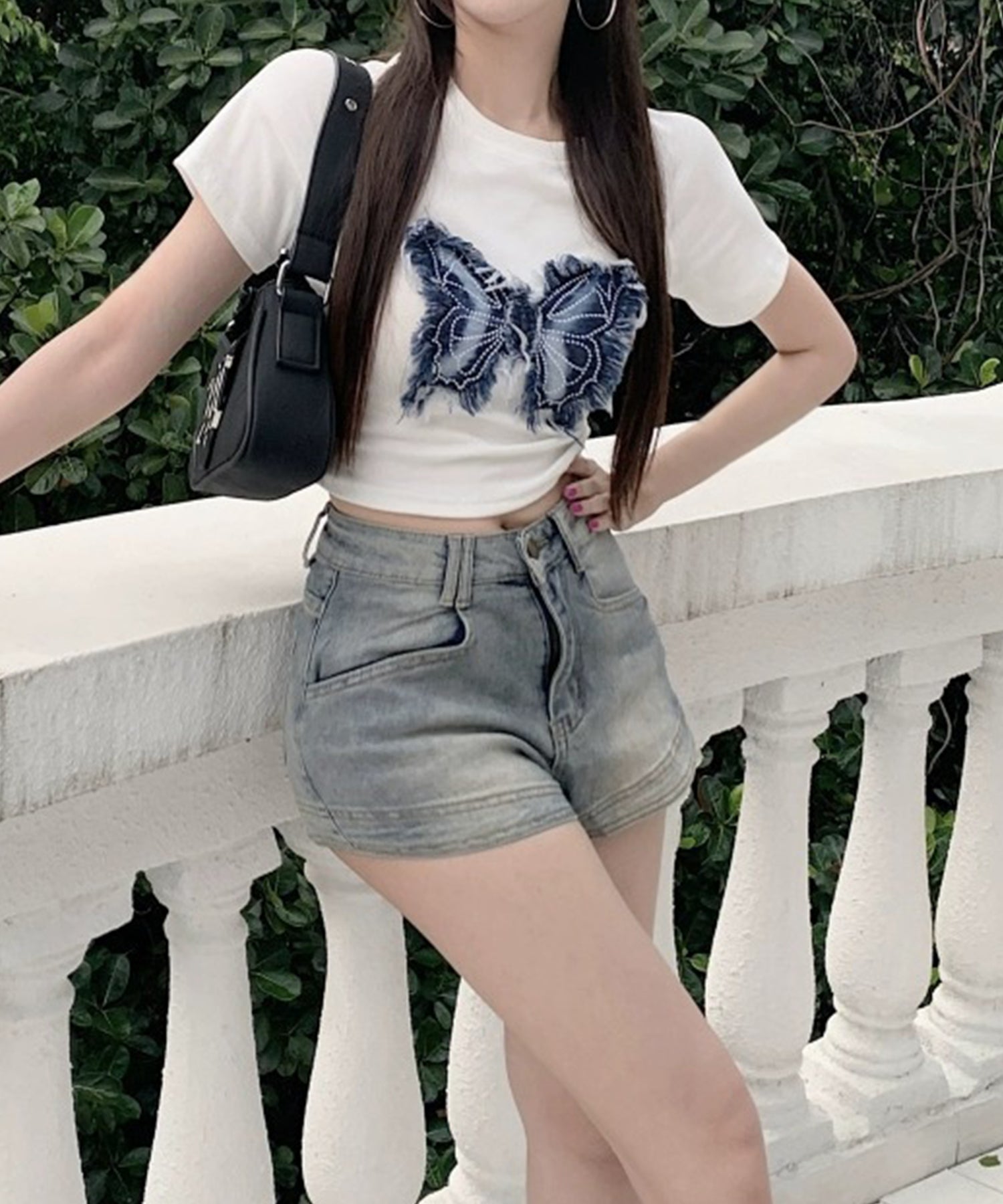 デニム地のバタフライモチーフが目を惹く半袖Tシャツ。