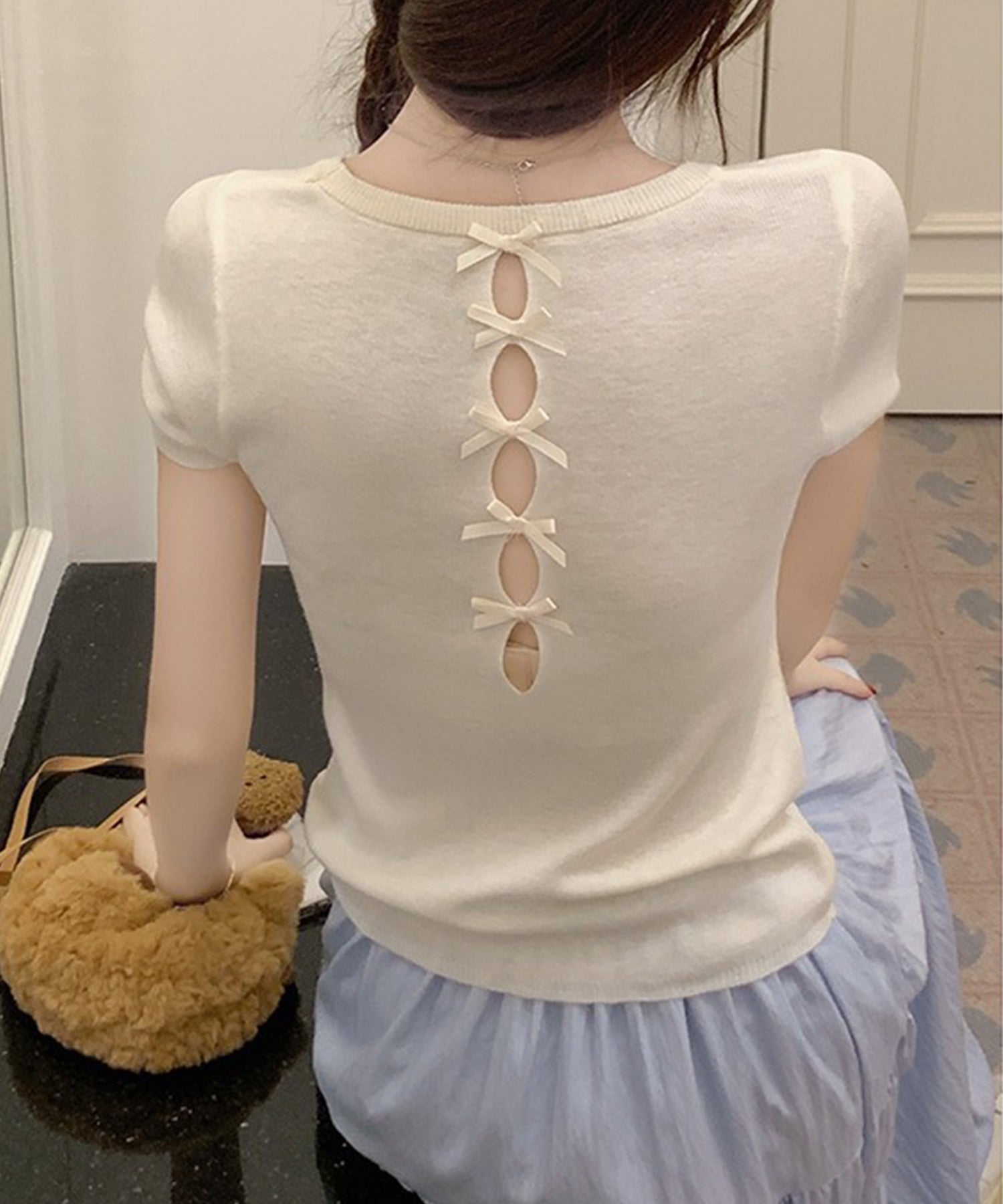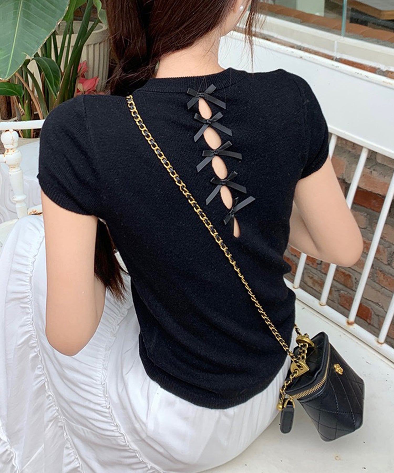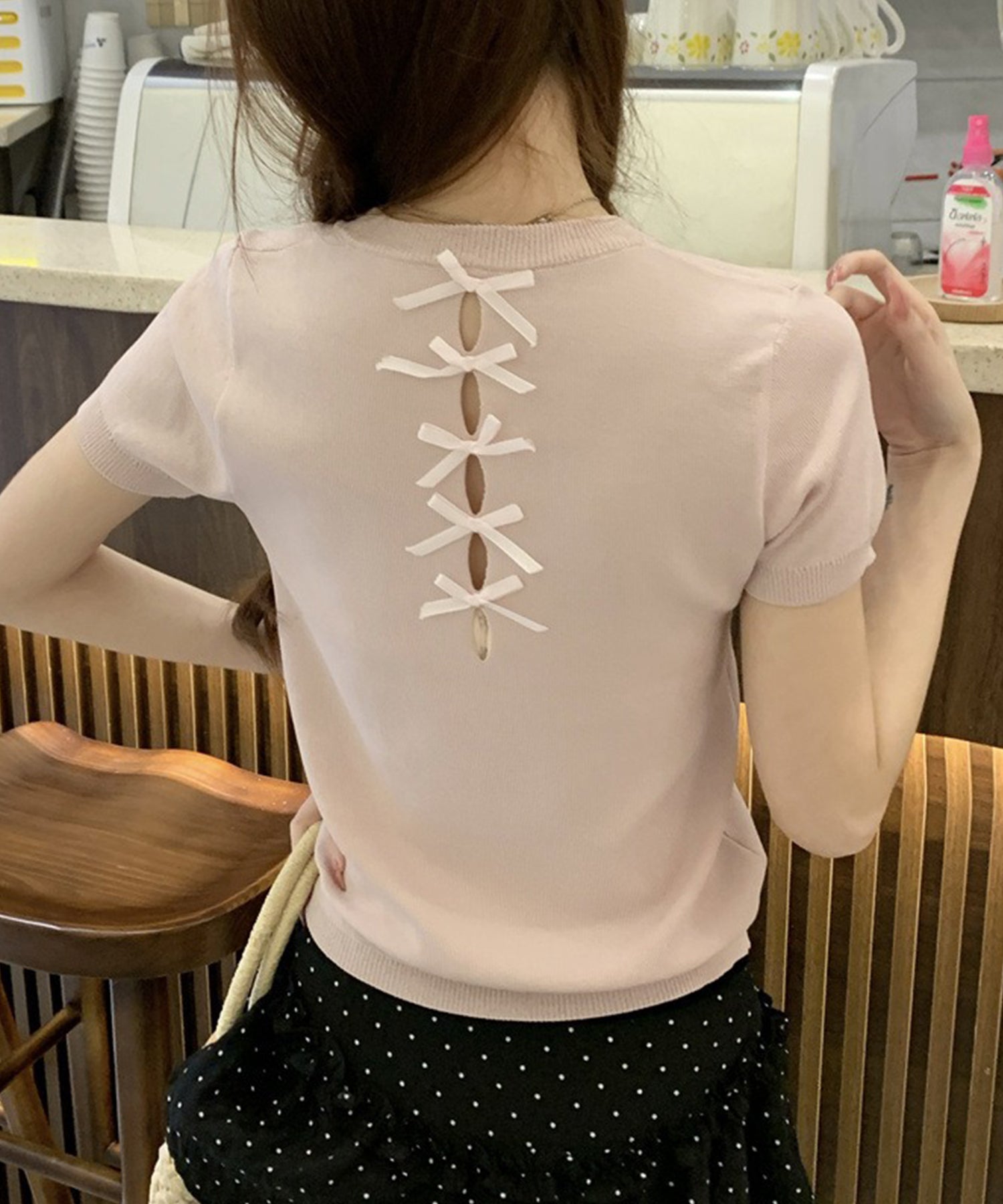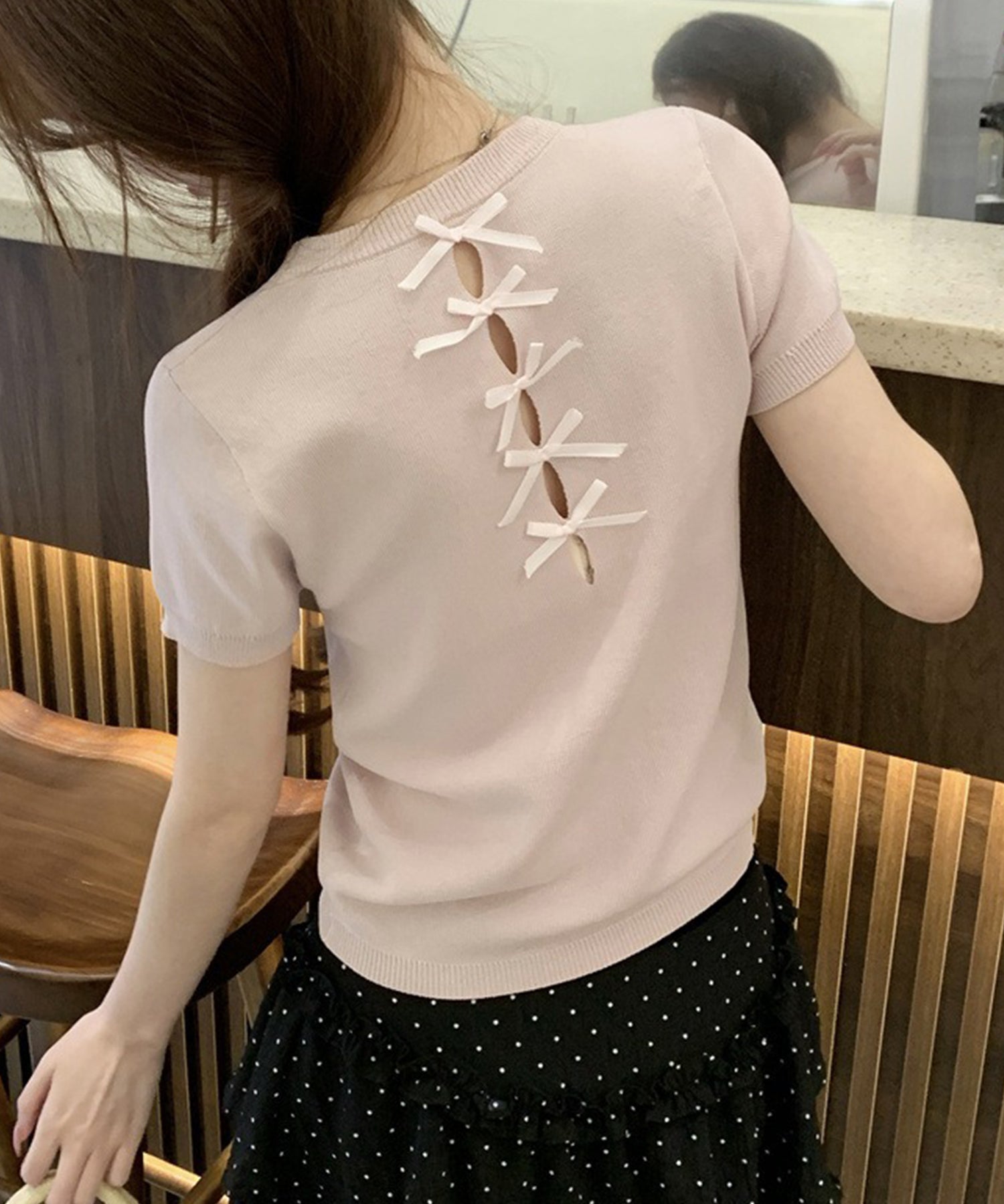 バックリボン クルーネック 半袖 ニット プルオーバー