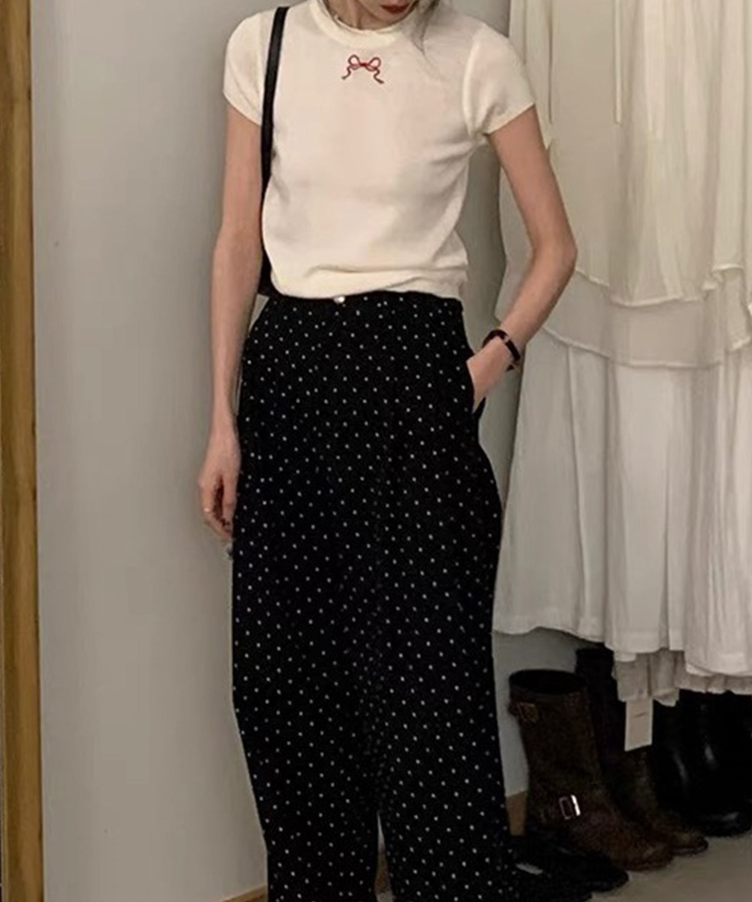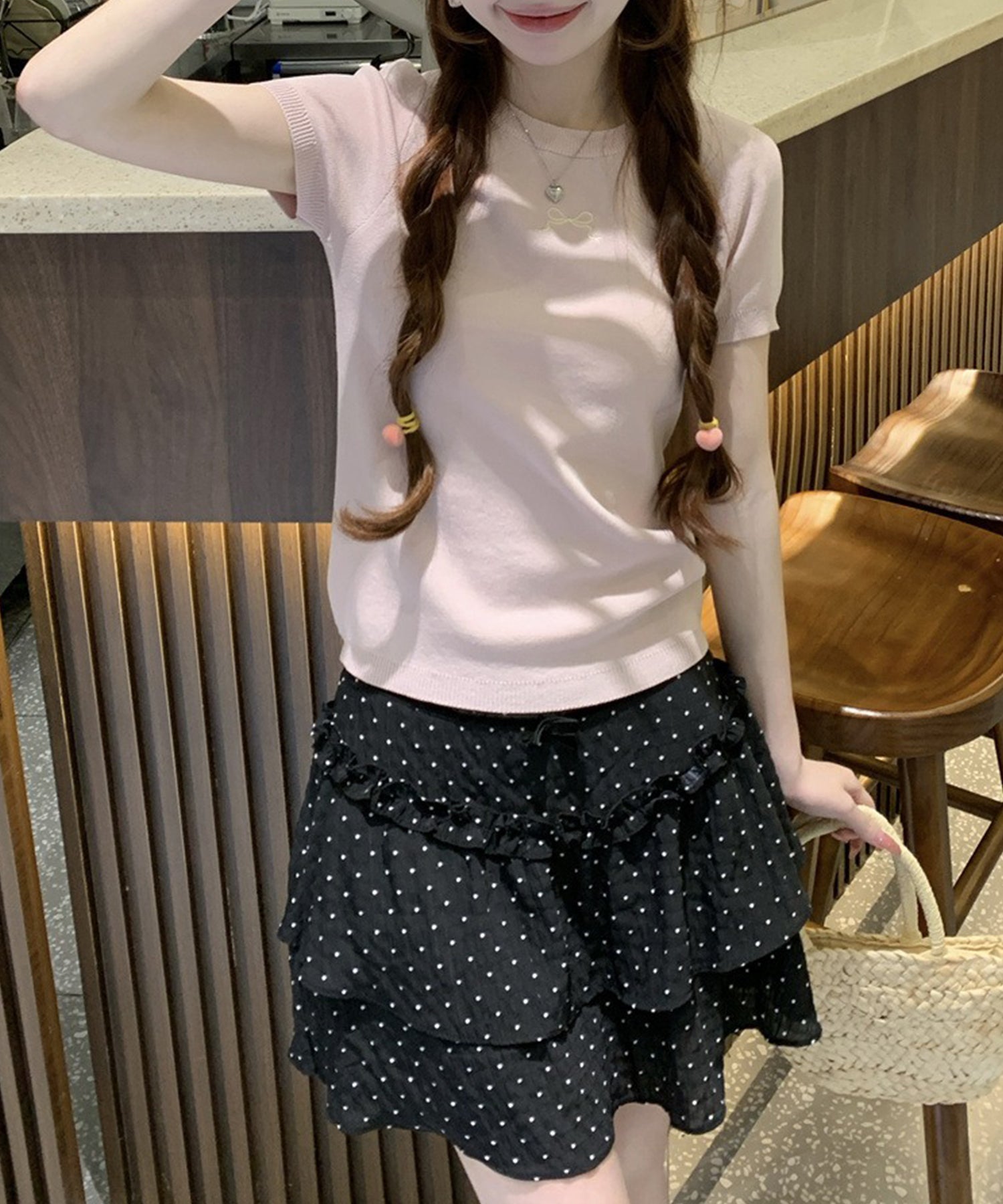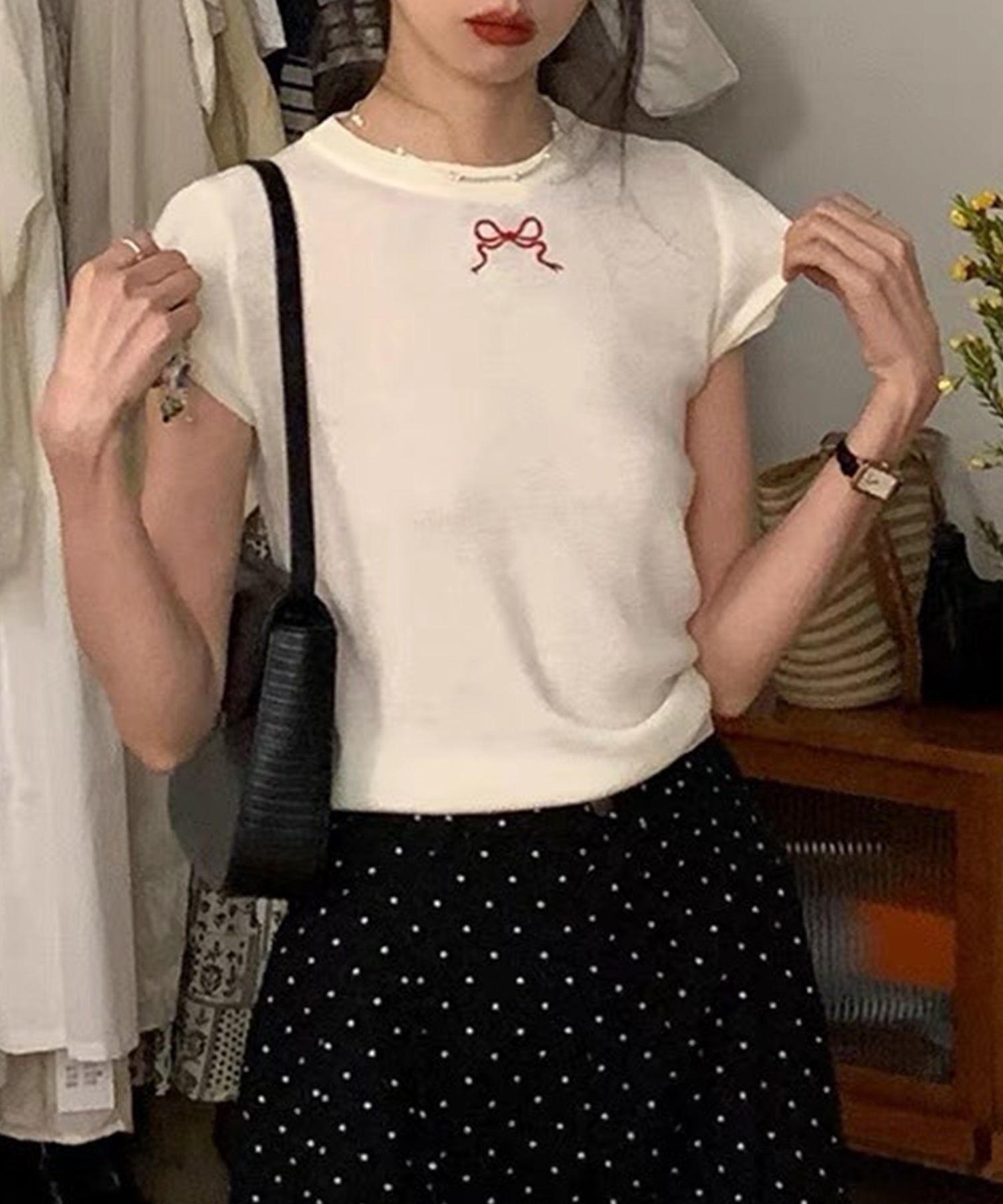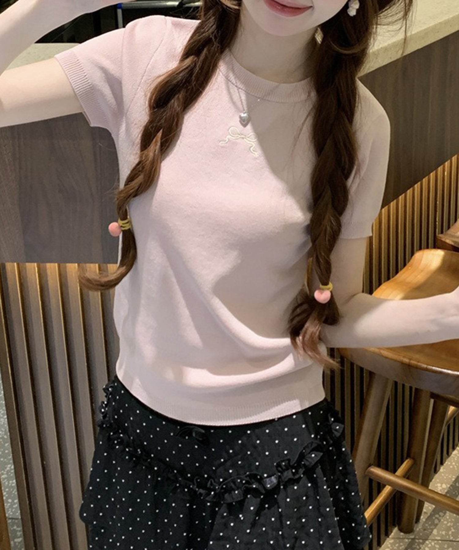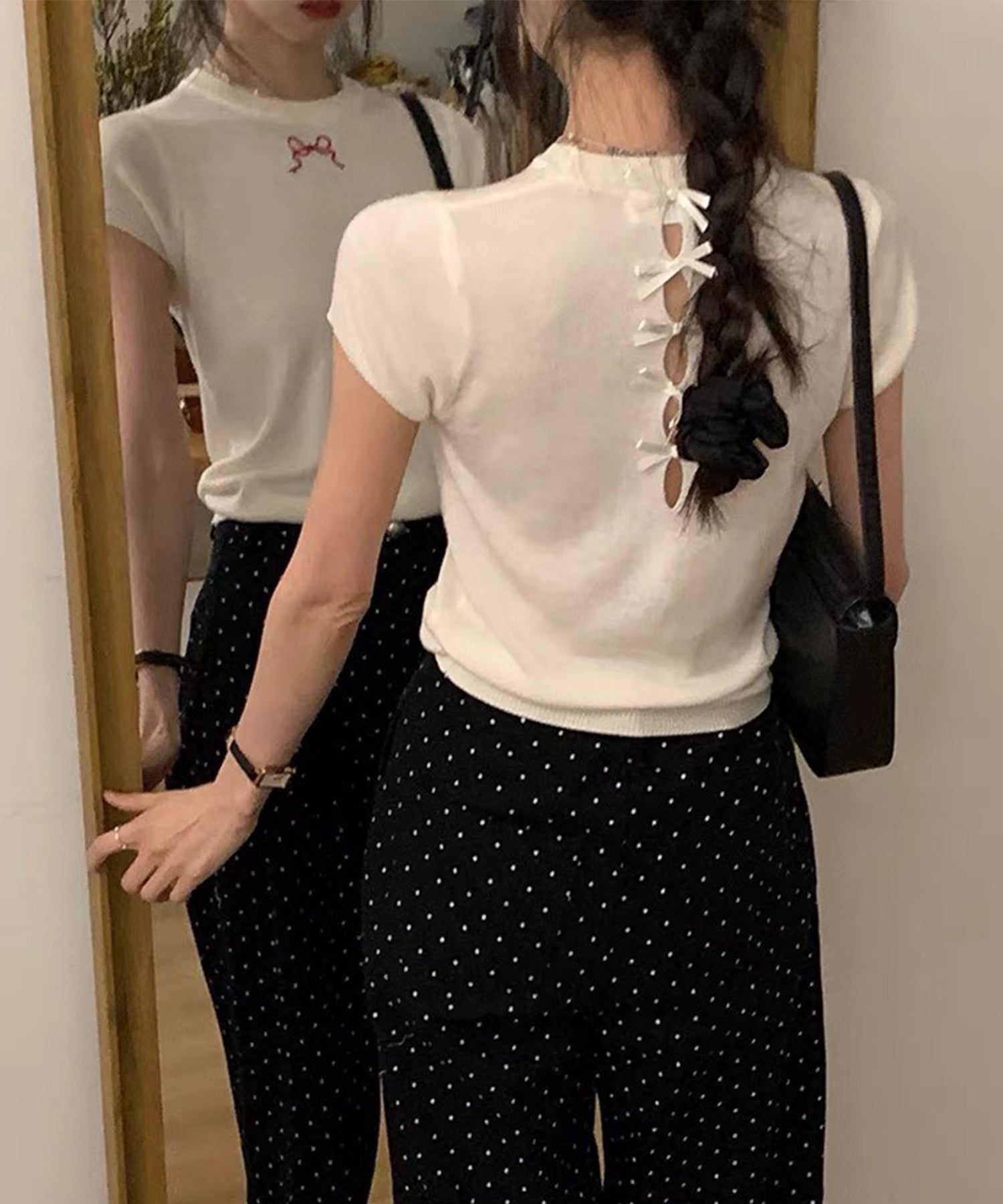 バックリボン クルーネック 半袖 ニット プルオーバー