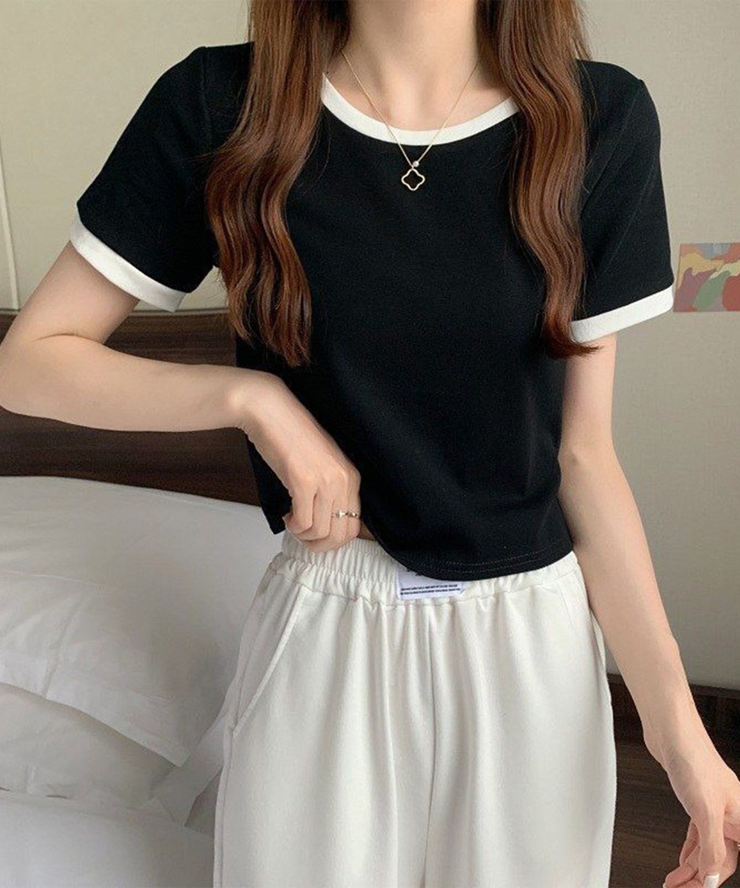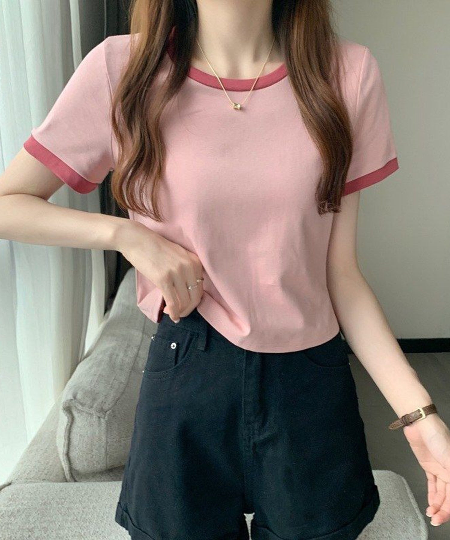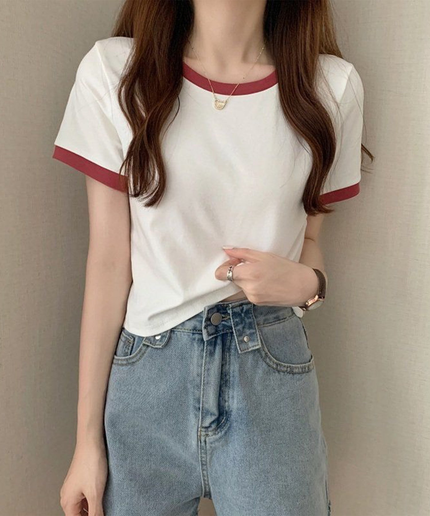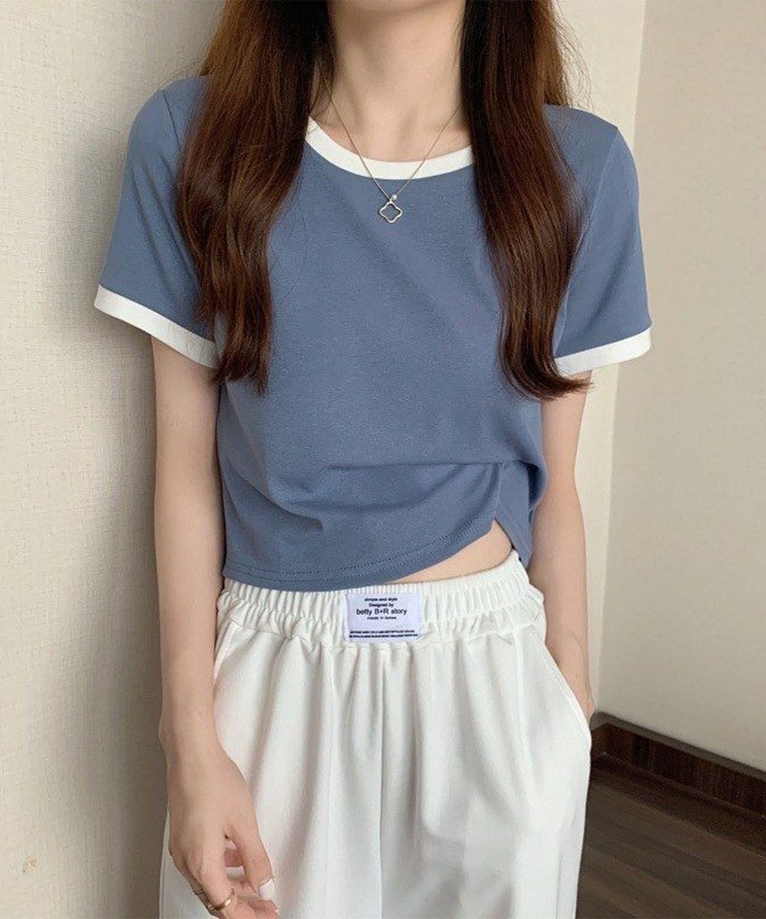 配色 クロップド丈 クルーネック 半袖 Tシャツ
